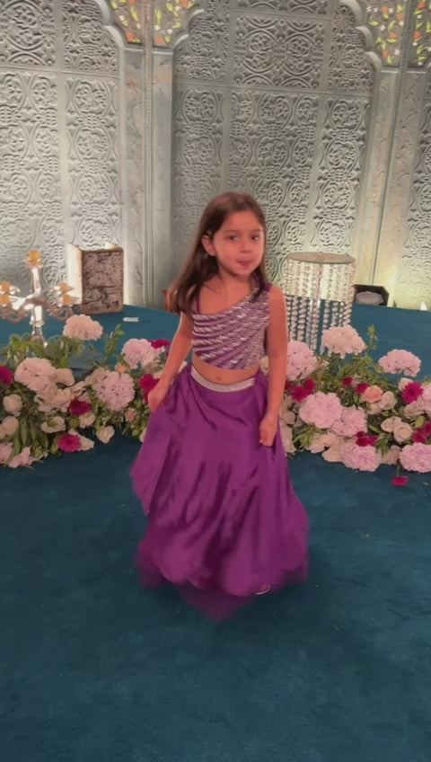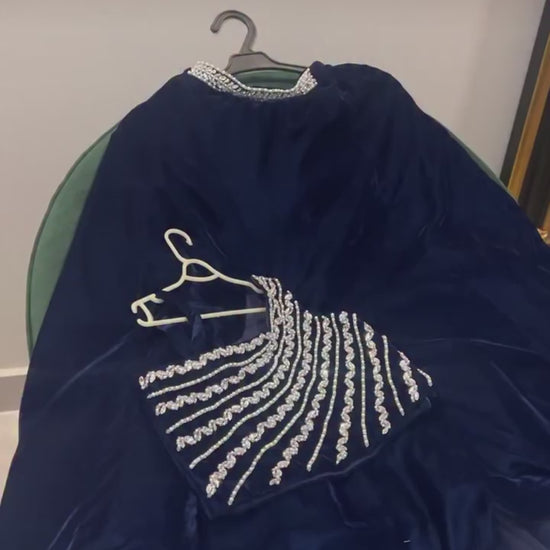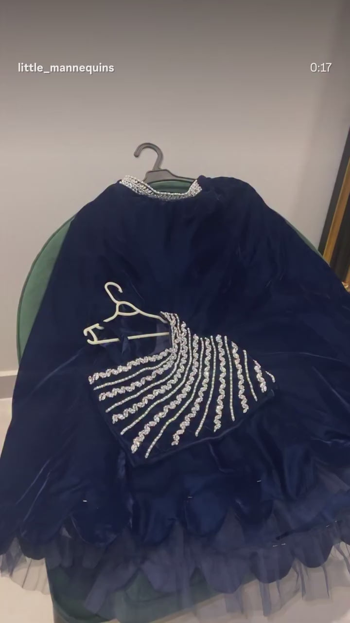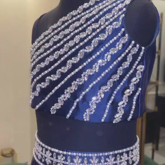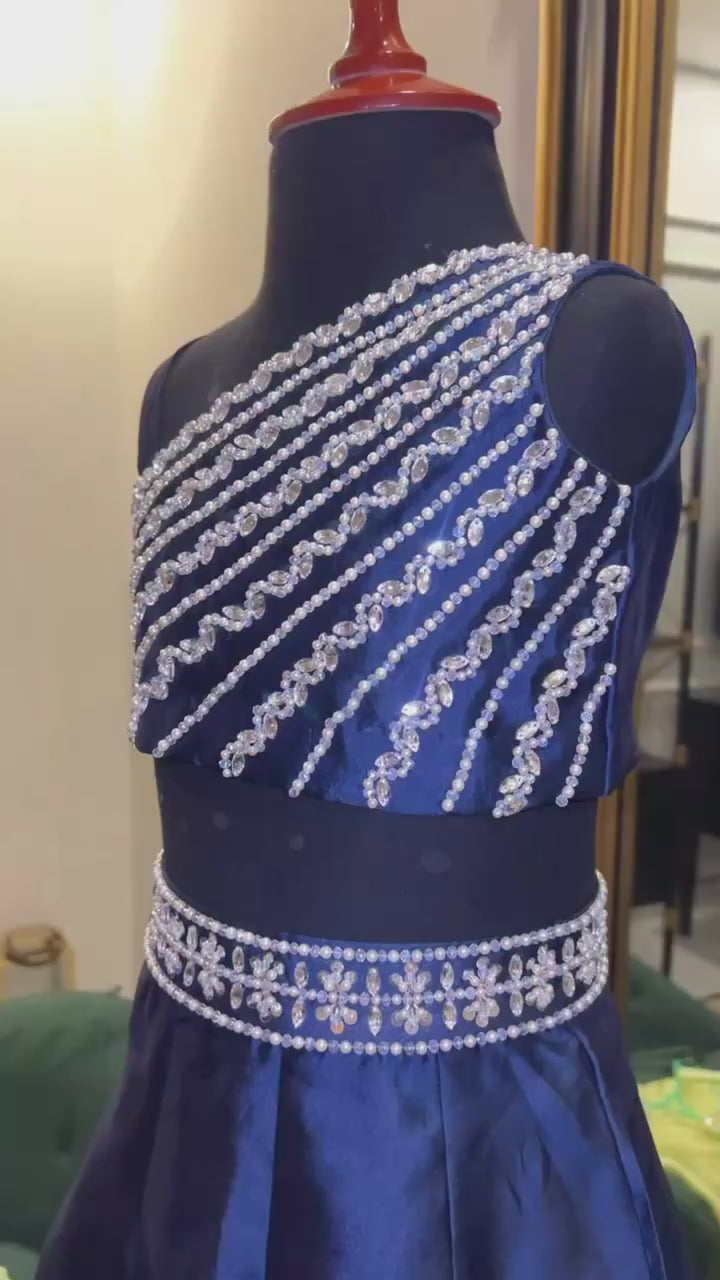 This is a navy blue, two-piece formal set for a young girl. It features a one-shoulder crop top heavily embellished with diagonal rows of silver pearls and sequins. The matching skirt includes a decorative silver waistband and a scalloped hemline.